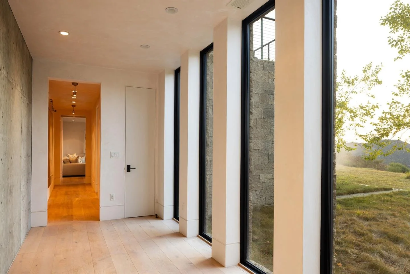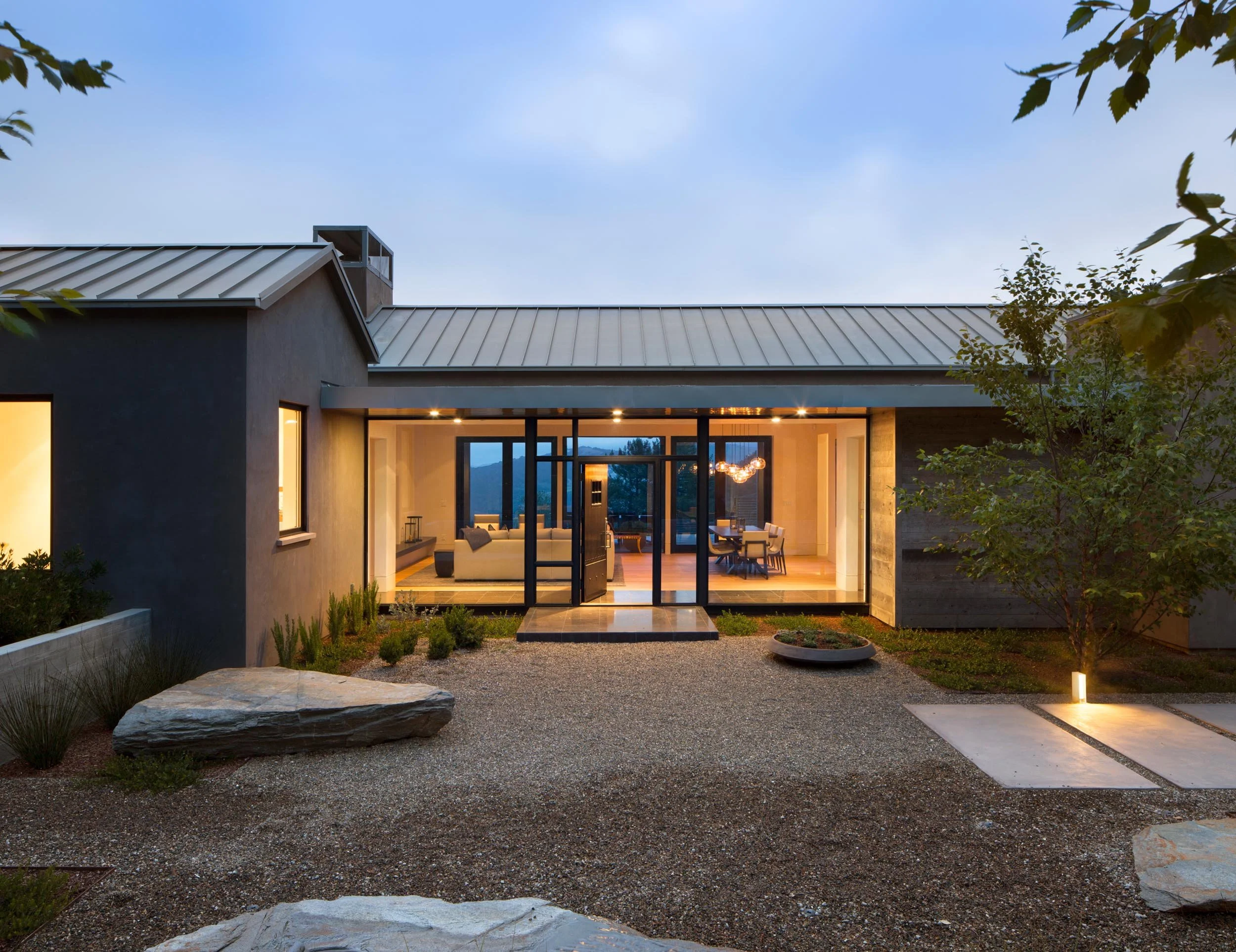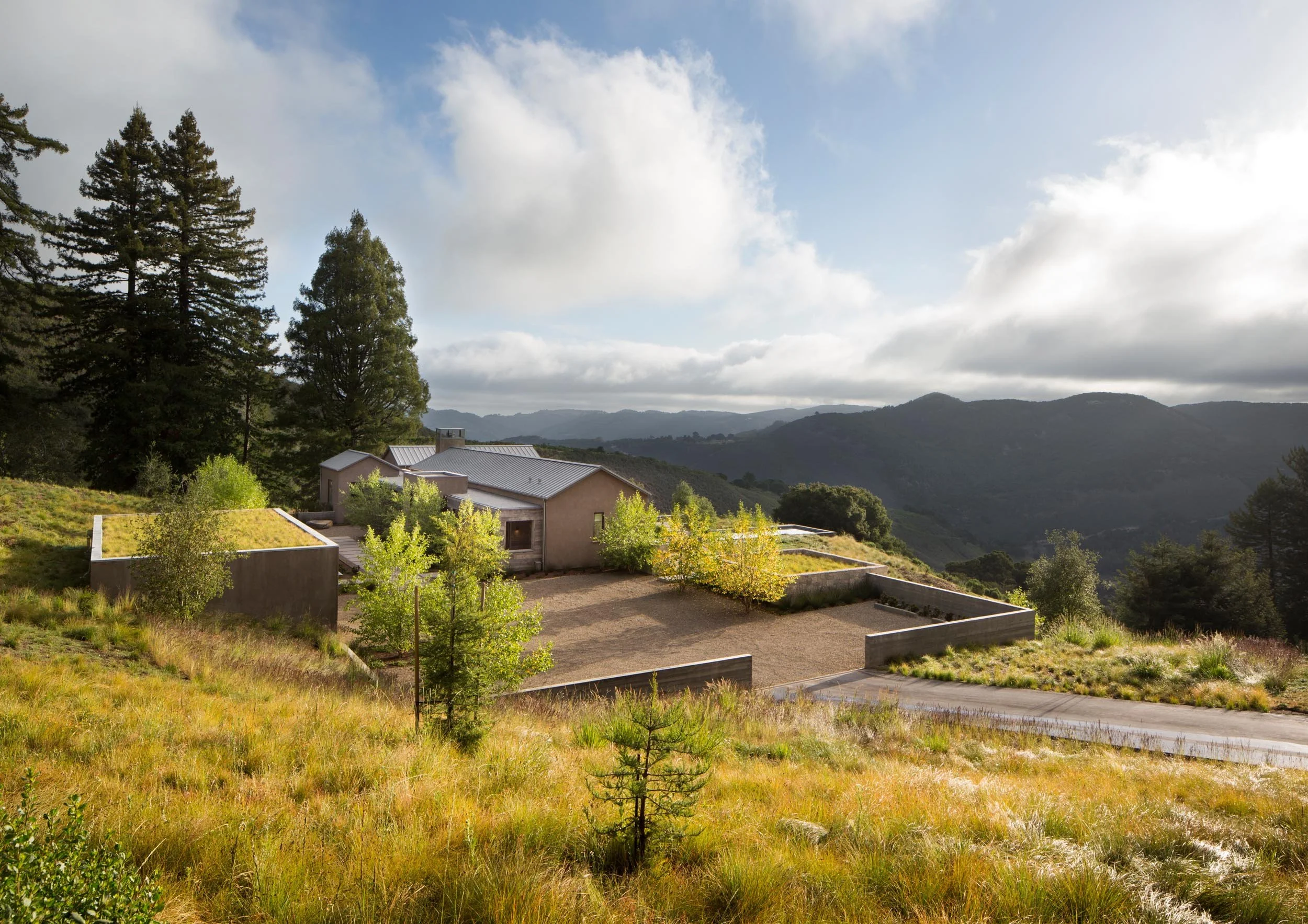 A contemporary retreat in dialogue with nature. Set into a wooded hillside above the rolling Carmel Valley, this home is shaped by land, light, and long views. Low, linear forms with a combination of metal gabled and flat green roofs anchor the architecture to its site, while warm materials—wood, stone, and concrete—soften the modern palette. Expansive glazing and layered terraces extend living spaces outward, creating a retreat that feels both sheltered and expansive.