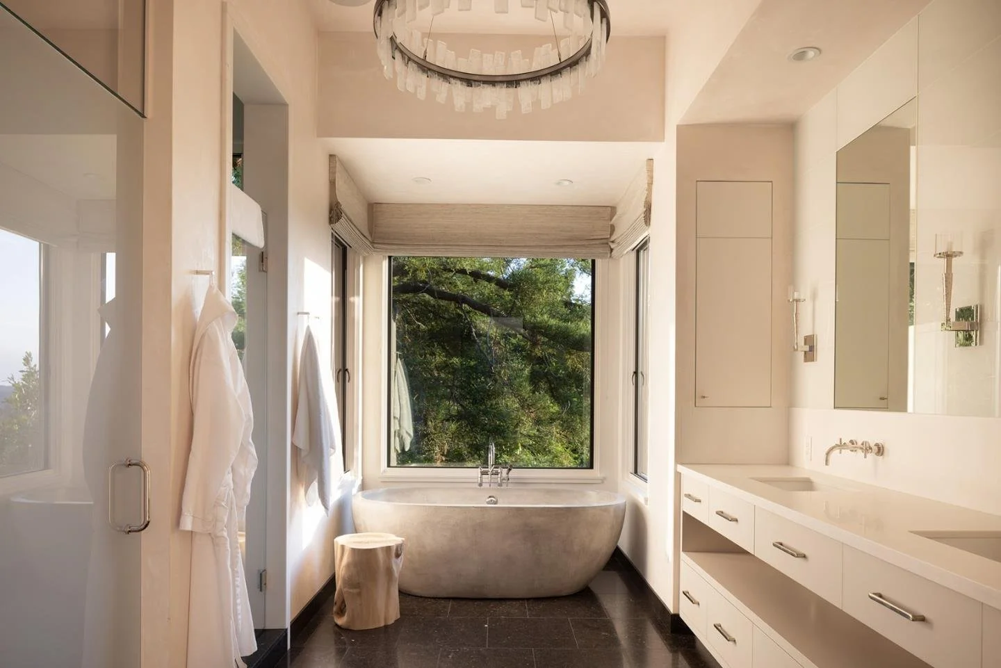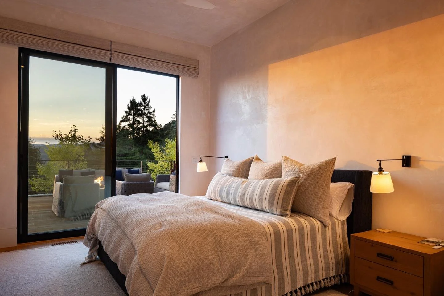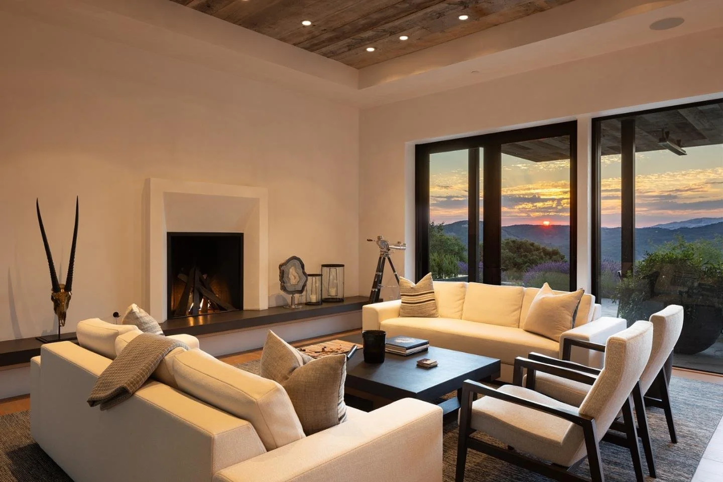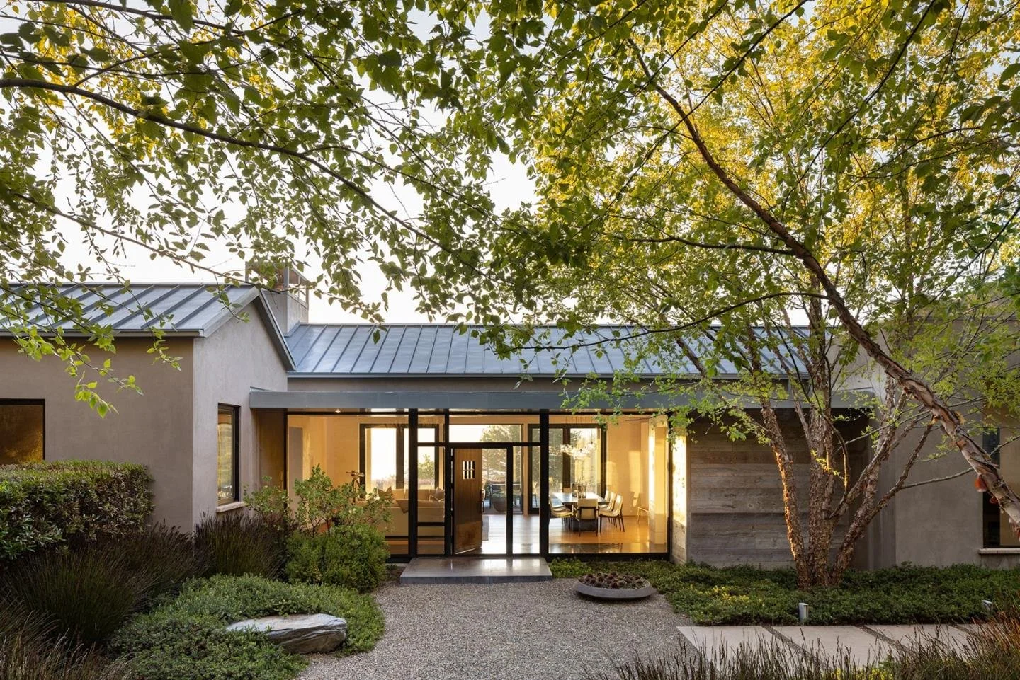 A contemporary retreat in dialogue with nature. Set into a wooded hillside above the rolling Carmel Valley, this home is shaped by land, light, and long views. Low, linear forms with a combination of metal gabled and flat green roofs anchor the architecture to its site, while warm materials—wood, stone, and concrete—soften the modern palette. Expansive glazing and layered terraces extend living spaces outward, creating a retreat that feels both sheltered and expansive.